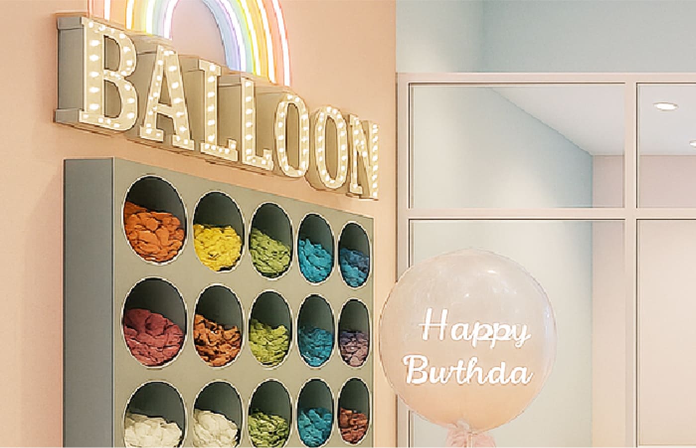 ネオンライトとバルーン装飾が光るSNS映え空間。