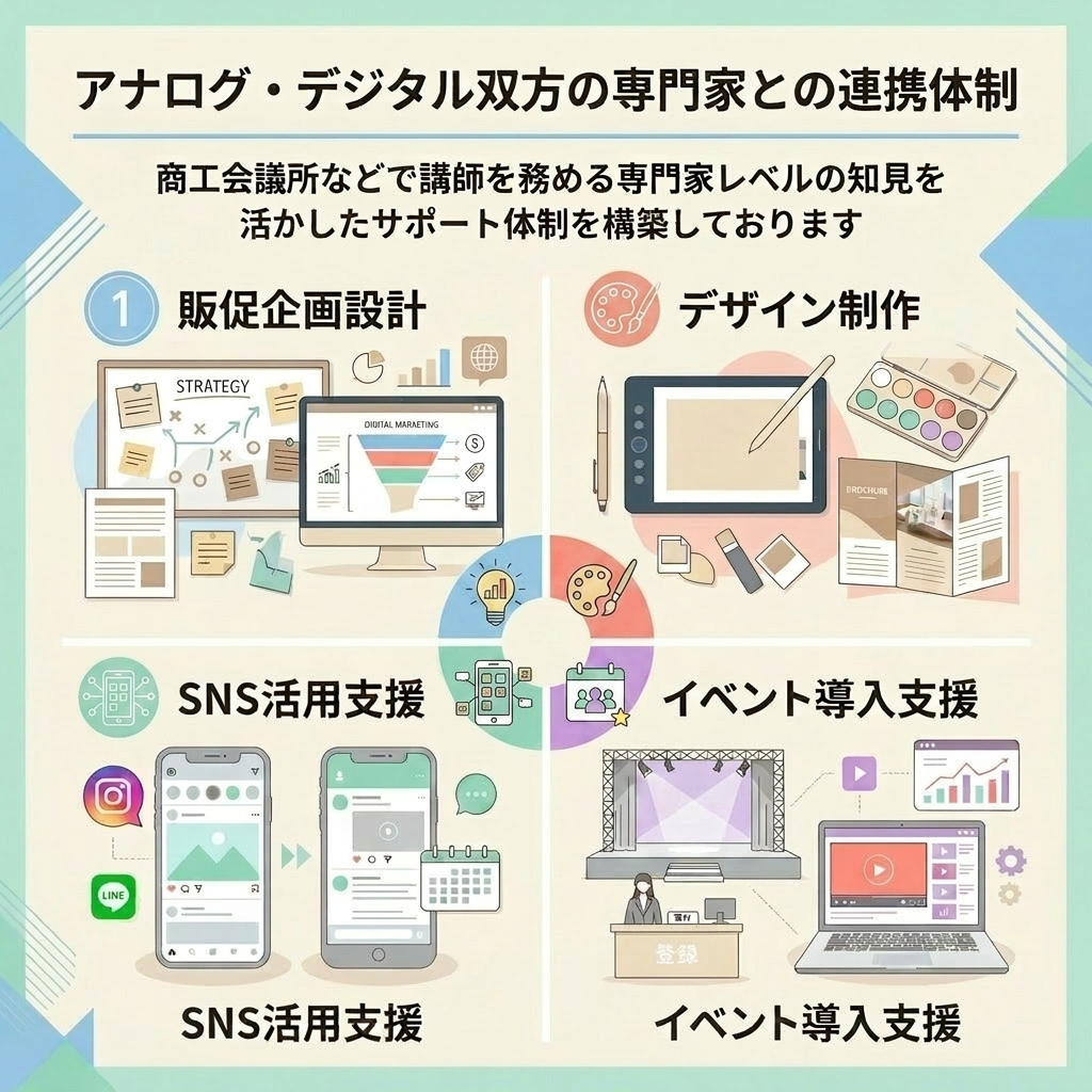 当店では、アナログ・デジタル双方の専門家との連携体制を整えており、商工会議所などで講師を務める専門家レベルの知見を活かしたサポート体制を構築しております。
