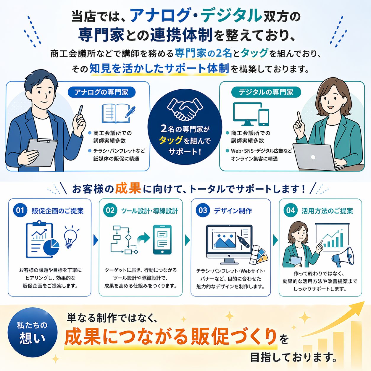 単なる制作ではなく、 成果につながる販促づくりを目指しております。