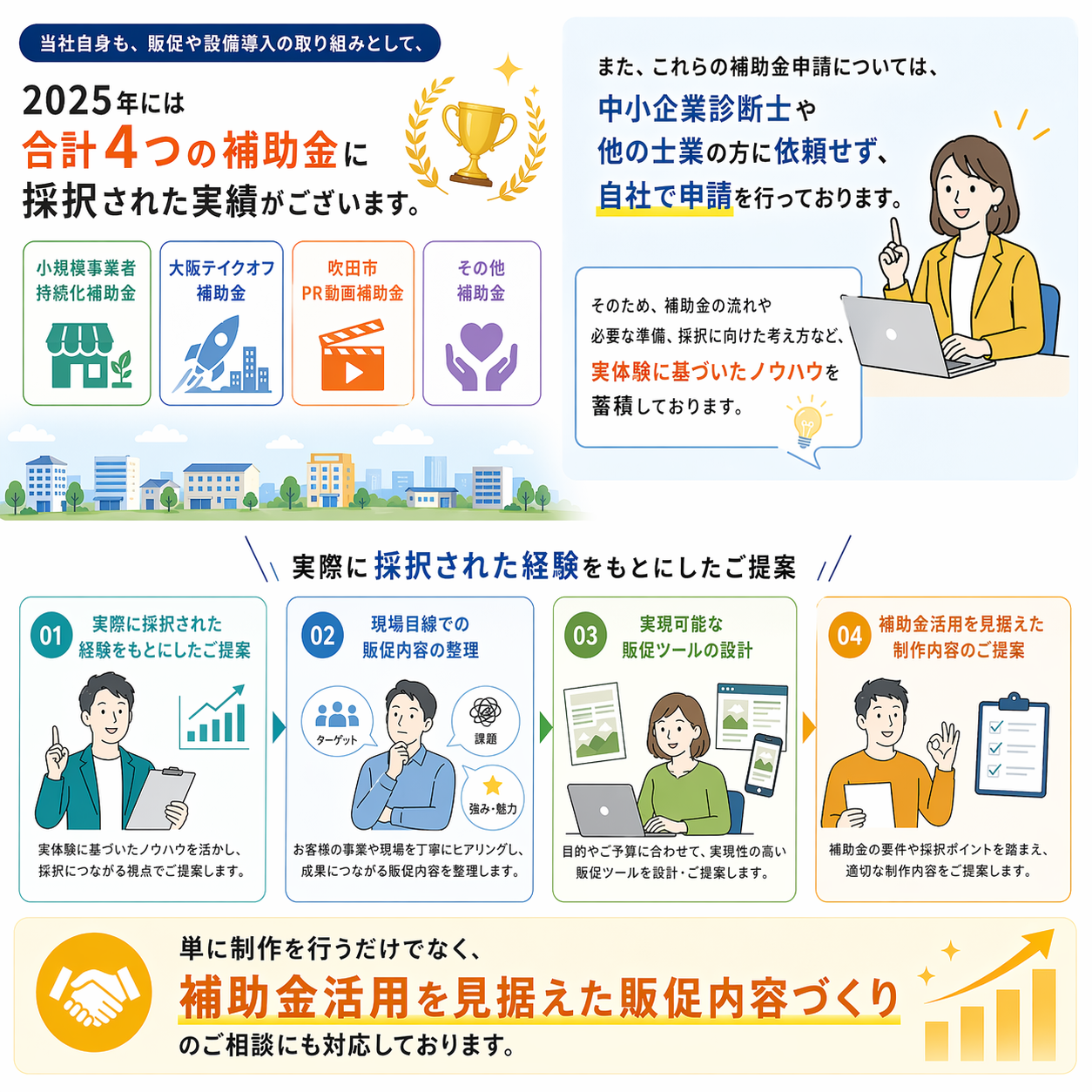 当社自身も、販促や設備導入の取り組みとして、 2025年には小規模事業者持続化補助金をはじめ、大阪テイクオフ補助金、吹田市PR動画補助金など、合計4つの補助金に採択された実績がございます。
