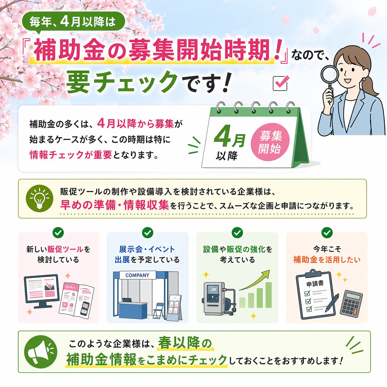 補助金の多くは、 4月以降から募集が始まるケースが多く、この時期は特に情報チェックが重要となります。
