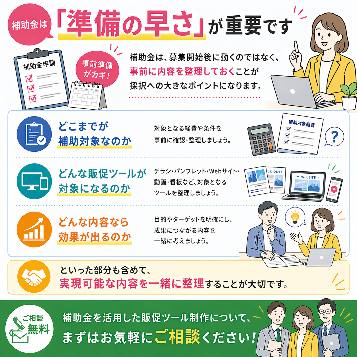 補助金は、募集開始後に動くのではなく、事前に内容を整理しておくことが採択への大きなポイントになります。