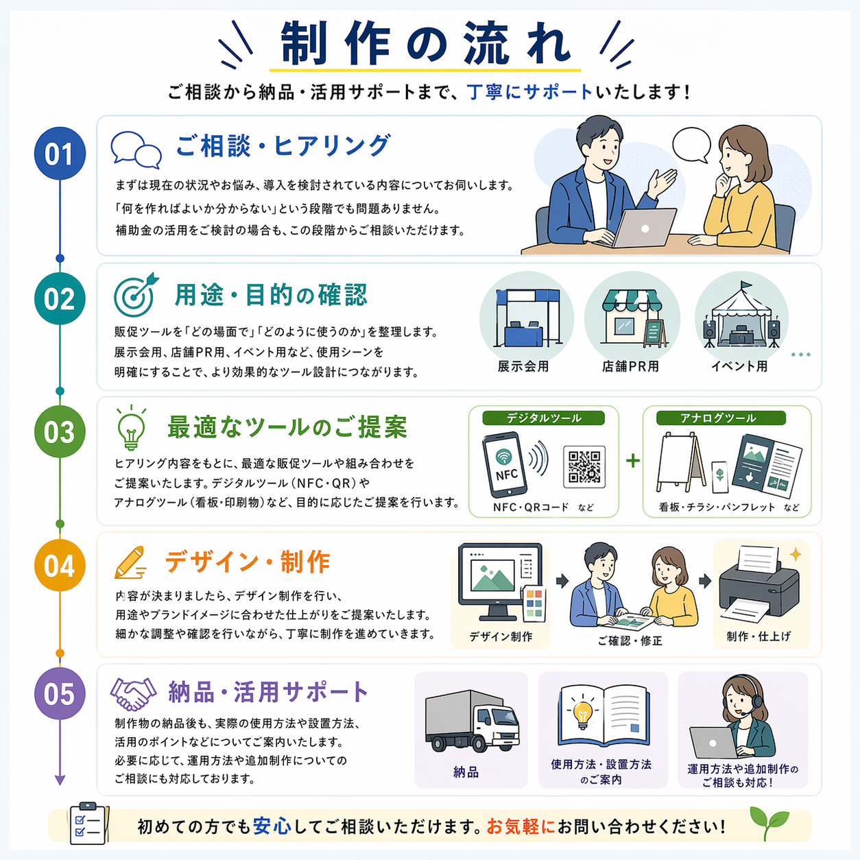 ヒアリング内容をもとに、最適な販促ツールや組み合わせをご提案いたします。