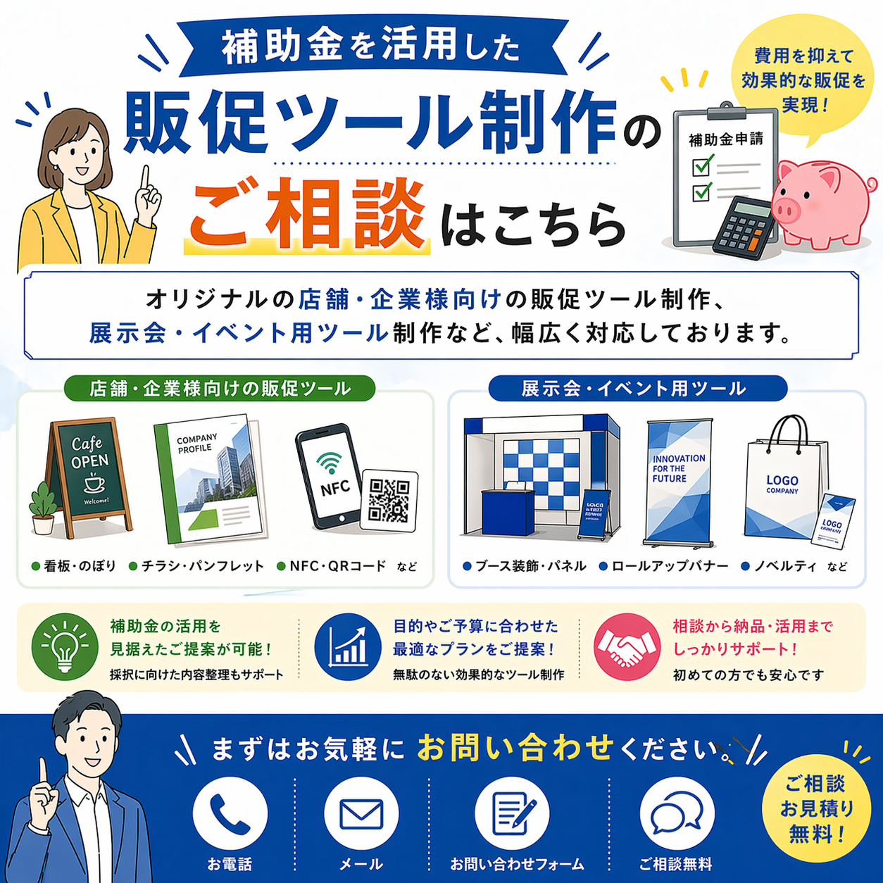 補助金を活用した販促ツール制作について、まずはお気軽にご相談ください。