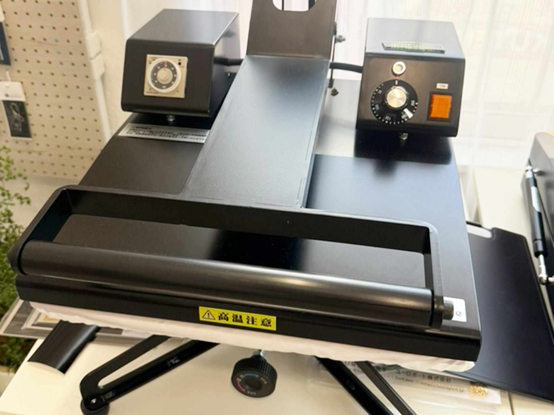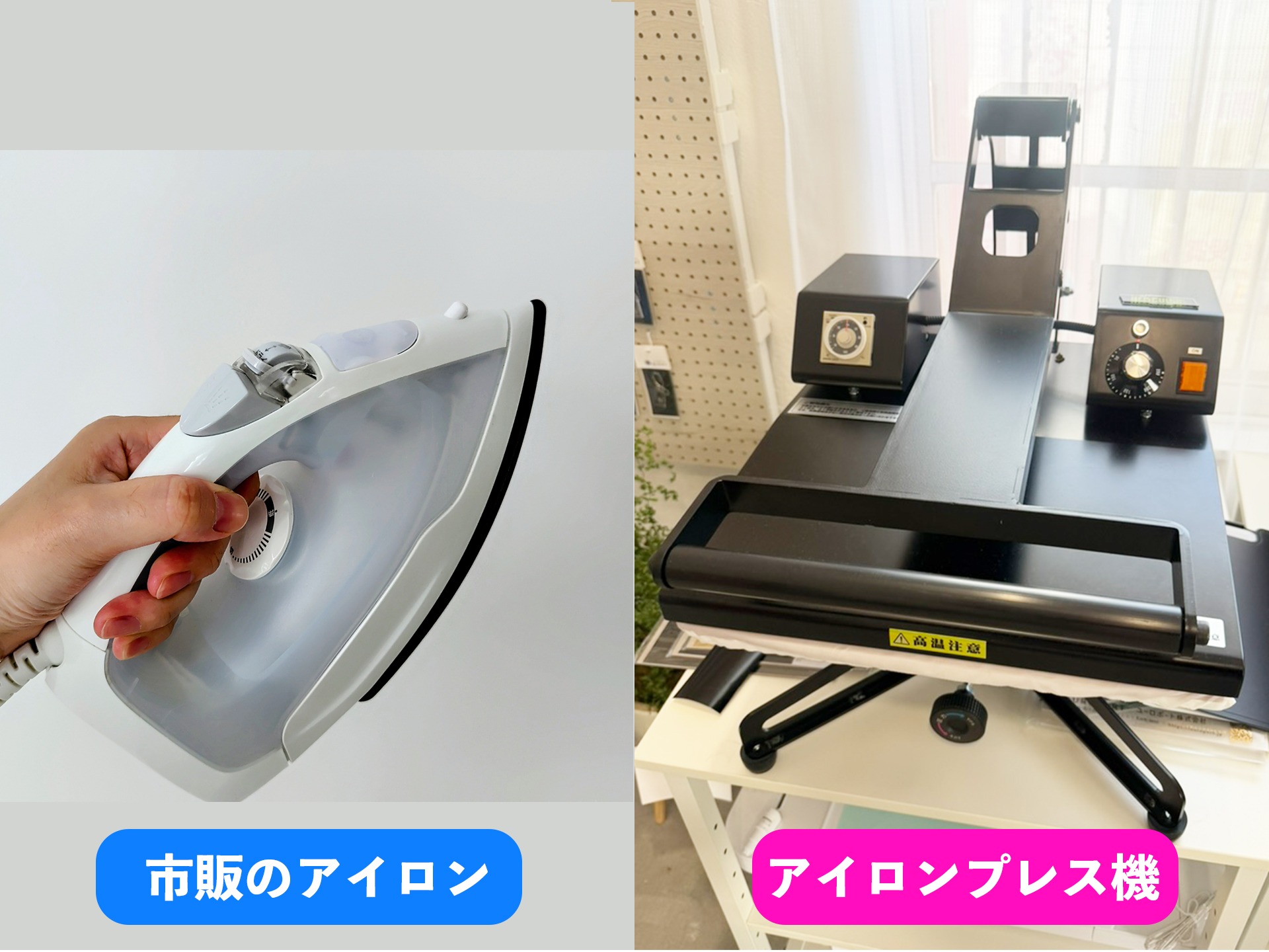 市販のアイロンは温度が上下しやすいため、しっかり接着できなかったり、部分的に浮いてしまったり、洗濯で剥がれやすくなることがあります。一方、業務用アイロンプレスは設定した温度を一定に保ちやすいため、素材にしっかり定着させやすくなります。